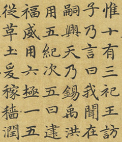 元趙孟頫畫箕子授書圖并書洪範卷,台北故宫博物院藏。釋文:惟十有三祀。王訪于箕子。王乃言曰。嗚呼箕子。惟天陰騭下民。相協厥居。我不知其彝倫攸敘。箕子乃言曰。我聞在昔。鯀陻洪水。汨陳其五行。帝乃震怒。不畀洪範九疇。彝倫攸斁。鯀則殛死。禹乃嗣興。天乃錫禹洪範九疇。彝倫攸敘。初一曰五...