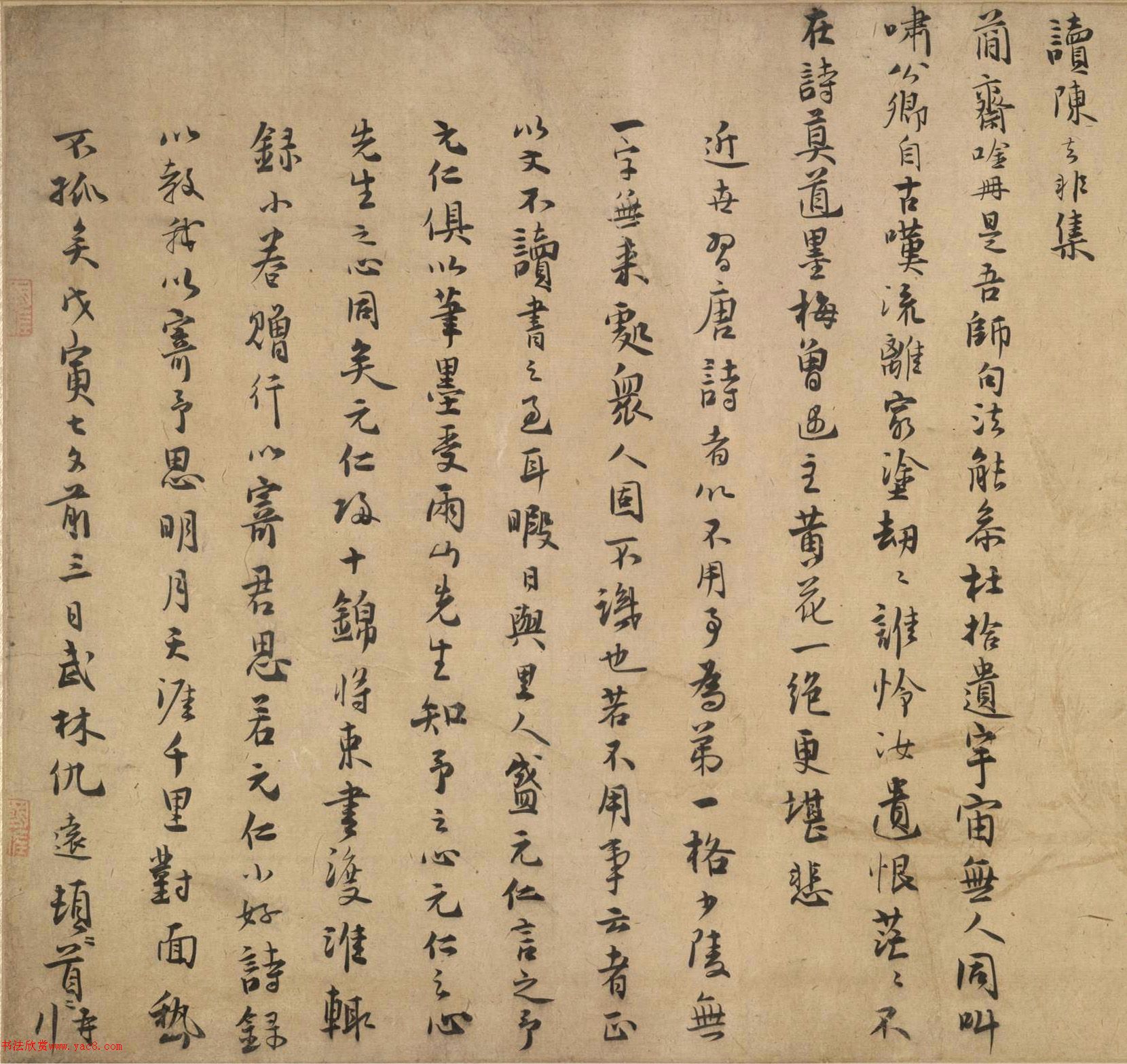 仇远书法真迹长篇巨制《自书诗》(3) 2013/12/24 作者:书法欣赏 来源:www.yac8.com 阅读:13333 戊寅七夕前三日武林仇遠頓首再拜 上一页跳页下一页 上一条 陈献章行草书法作品《种蓖麻诗卷》 下一条 宋高宗赵构真草书法欣赏《嵇康养生论卷》