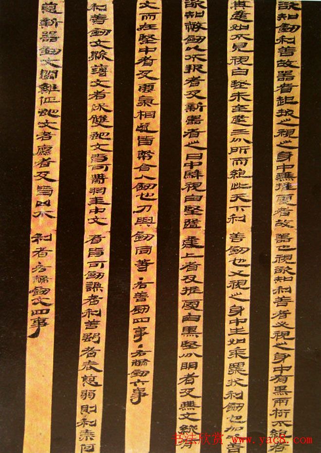 西汉简书欣赏《相利善剑》六简 2014/11/8 作者:书法欣赏 来源:www.yac8.com 阅读:19382 西汉简书《相利善剑》全册6简,209字,书写规整,墨色如新,有编绳契口3道。约为西汉末或王莽时物。主要内容是鉴定刀剑的有关标准,其中包括善剑标准4条、弊剑标准6条和弊剑花(纹)4条,为后人留下了鉴定刀剑的宝贵知识。 上一页跳页下一页 上一条 黄宗壤书法鉴赏《盐井赋》高清册页 下一条 郑燮行书欣赏《郑板桥书田游岩碑》