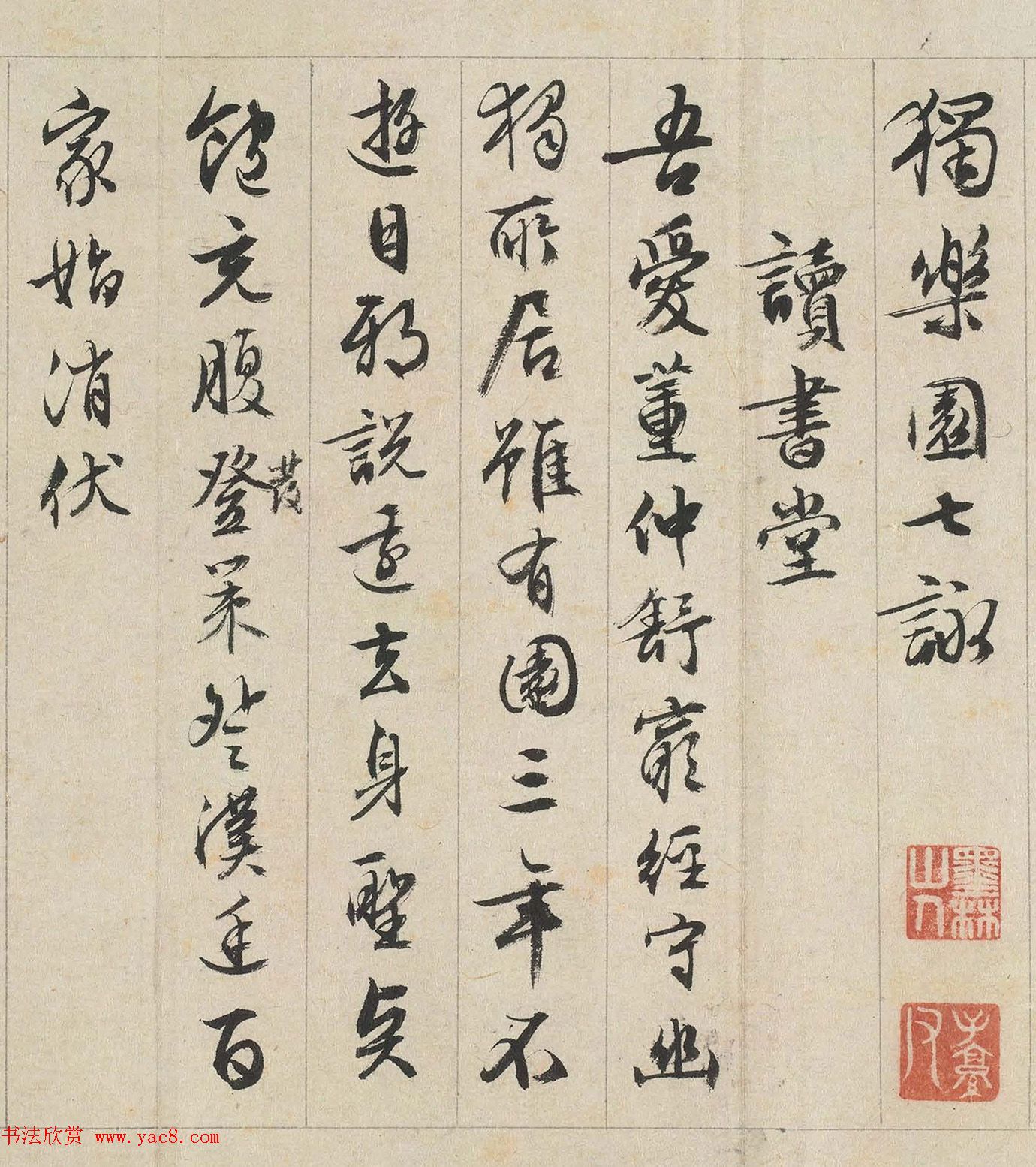 文徵明行书《独乐园七咏+东坡独乐园诗》 2019/4/11 作者:书法欣赏 来源:www.yac8.com 阅读:52150 文徵明行书《独乐园七咏》、《东坡独乐园诗》,来源:明代仇英绘《独乐园图》卷后拖尾,此卷历经明项元汴、清翁同龢递藏,现藏于美国克利夫兰艺术博物馆。 独乐园七咏--读书堂 钓鱼菴 采药圃 上一页跳页下一页该文章所属专题:文徵明书法 上一条 清代广州首富潘正炜小楷书法欣赏 下一条 明代唐寅书法七言诗《元镇江亭秋色图》