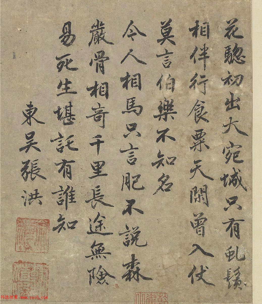 释文: 花骢初出大宛城。只有虬须相伴行。食粟天闲曾入仗。莫言伯乐不知名。今人相马只言肥。不说森严骨相奇。千里长途无险易。死生堪托有谁知。东吴张洪。