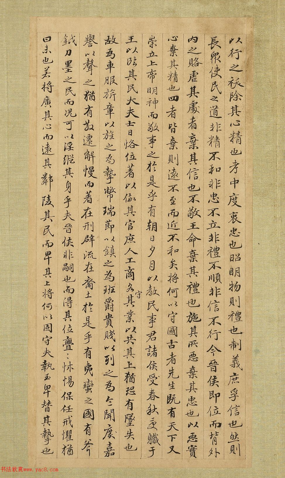 清代张照小楷《节书国语》册(3) 2023/8/31 作者:书法欣赏 来源:www.yac8.com 阅读:2157 周語上。第一。穆王將征犬戎。祭公謀父諫曰。不可。先王耀德不觀兵。夫兵戢而時動。動則威。觀則玩。玩則無震。是故周文公之頌曰。載戢干戈。載櫜弓矢。我求懿德。肆于時夏。允王保之。先王之於民也。茂正其德而厚其性。阜其財求而利其器用。明利害之鄉。以文修之。使務利而避害。懷德而畏威。故能保世以滋大。昔我先王世后稷。以服事虞夏......及惠后之難。王出在鄭。晉侯納之。襄王十六年。立晉文公。二十一年。以諸侯朝王于衡雍。且獻楚捷。遂為踐土之盟。於是乎始霸。雍正戊申(1728年)九月張照書。 上一页跳页下一页 上一条 明代大书法家詹希元楷书《叙字》 下一条 黄姬水小楷录赋得诗六首卷