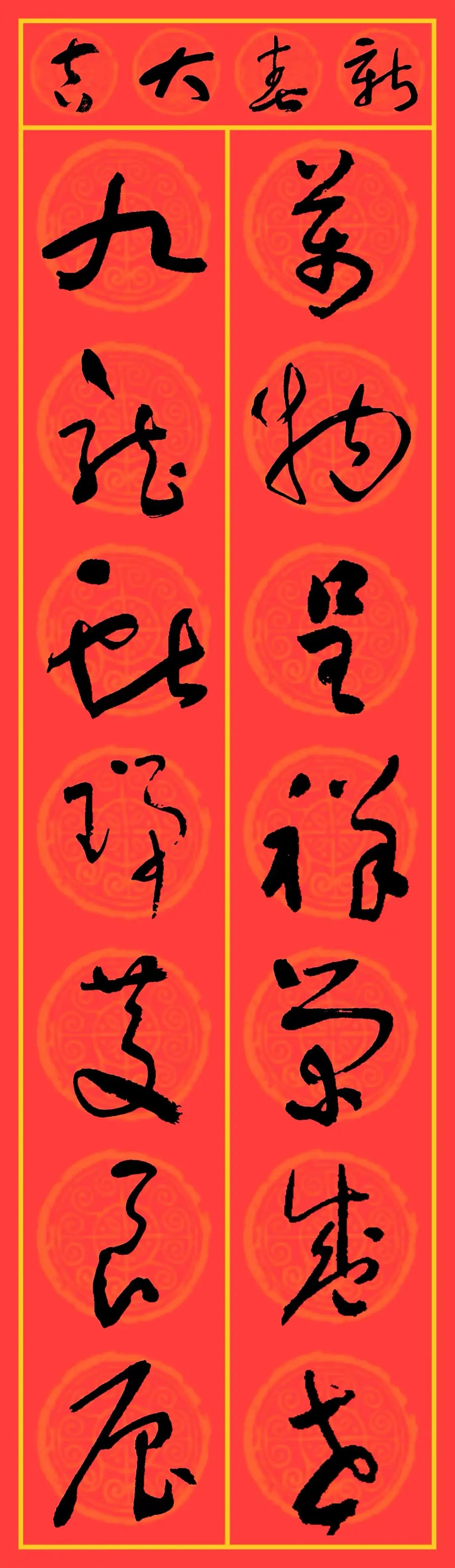 2024龙年于右任草书集字春联25副 2024/1/5 作者:书法欣赏 来源:www.yac8.com 阅读:4329 2024龙年于右任草书集字春联25副 龙门一跳迎新岁;燕子双飞报好音。 横批:恭贺新春 万物呈祥荣盛世;九龙献瑞庆良辰。 横批:新春大吉 玉兔辞年传吉利;金龙贺岁保平安。 横批:五福临门 喜庆爆竹送玉兔;吉祥梅花迎金龙。 横批:福满人间 一元复始龙增岁;万物生辉燕报春。 横批:春回大地 万里春风苏绿野;八方喜雨起苍龙。 横批:春意盎然 龙腾盛世千家喜;春满神州万物荣。 横批:繁荣昌盛 赤兔追风千里志;金龙拱日万家春。 横批:家和业兴 上一页跳页下一页该文章所属专题:于右任书法 上一条 范笑歌五体楷书龙年春联欣赏 下一条 名家名帖集字春联欣赏