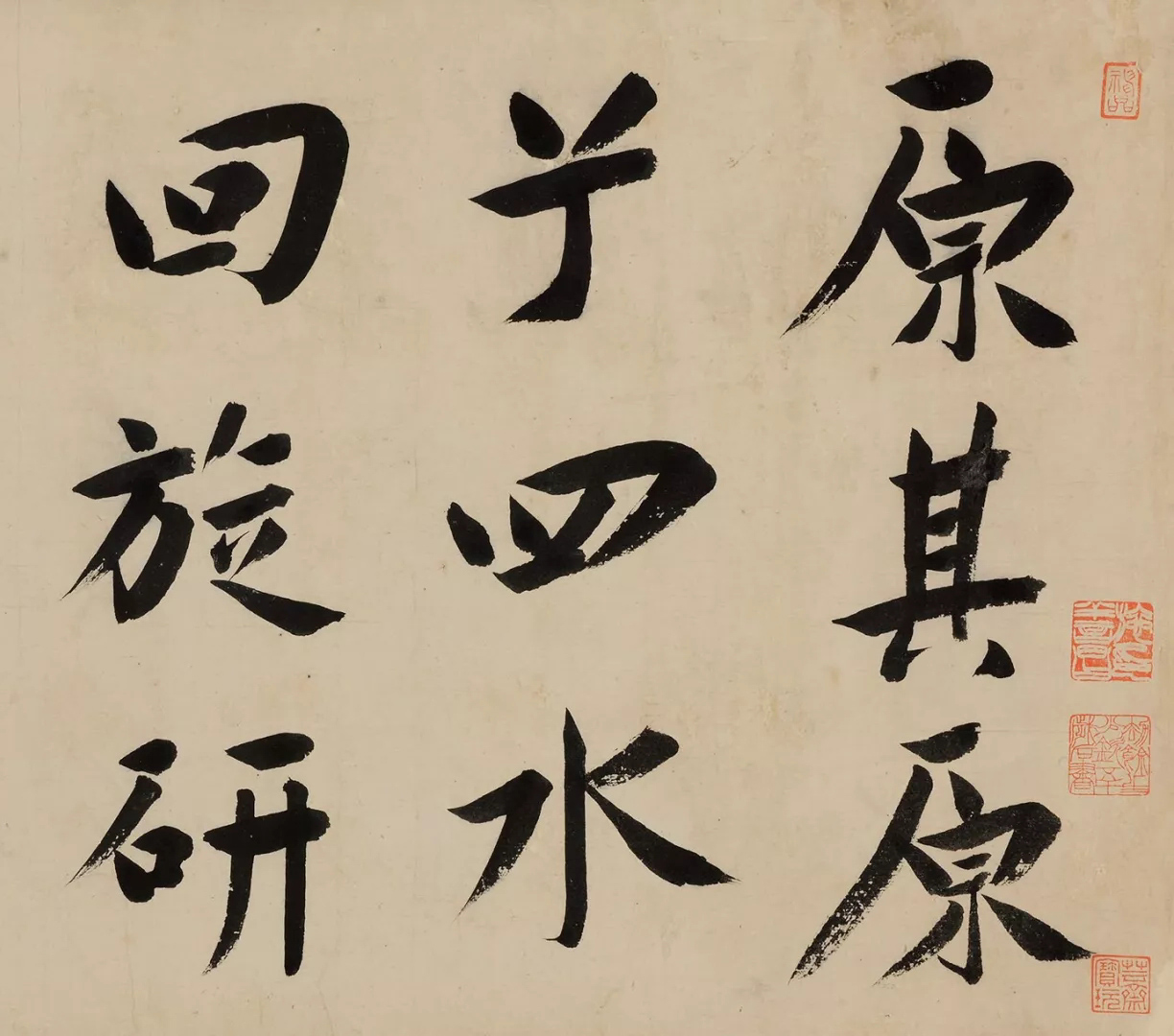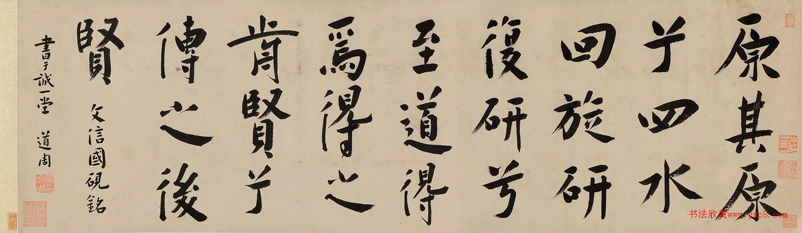 黄道周楷书文信国砚铭卷 2024/5/19 作者:书法欣赏 来源:www.yac8.com 阅读:1274 黄道周楷书文信国砚铭卷,水墨纸本,31×105cm,图源:北京保利拍卖。 此卷是黄道周罕见的大字楷书,清劲古朴,纸墨完好。“得”“前”二字为异体字,晚明书坛重镇中,喜欢在其书作中使用异体字的还有王铎、倪元璐和陈洪绶等,这均符合书家博学崇古,或与明末尚奇创新的时风潮流有关。 款识:文信国砚铭,书于诚一堂,道周。 声明:以上拍卖作品仅供学习参考,本站并不能保证作品的真实性。 该文章所属专题:黄道周书法 上一条 明代王宠行书秋兴八首卷 下一条 董其昌草书诗卷《孤山寺》