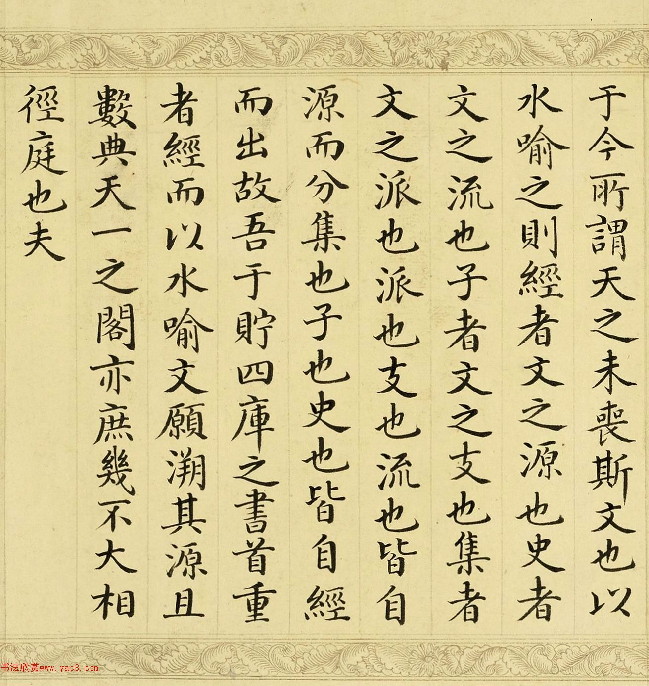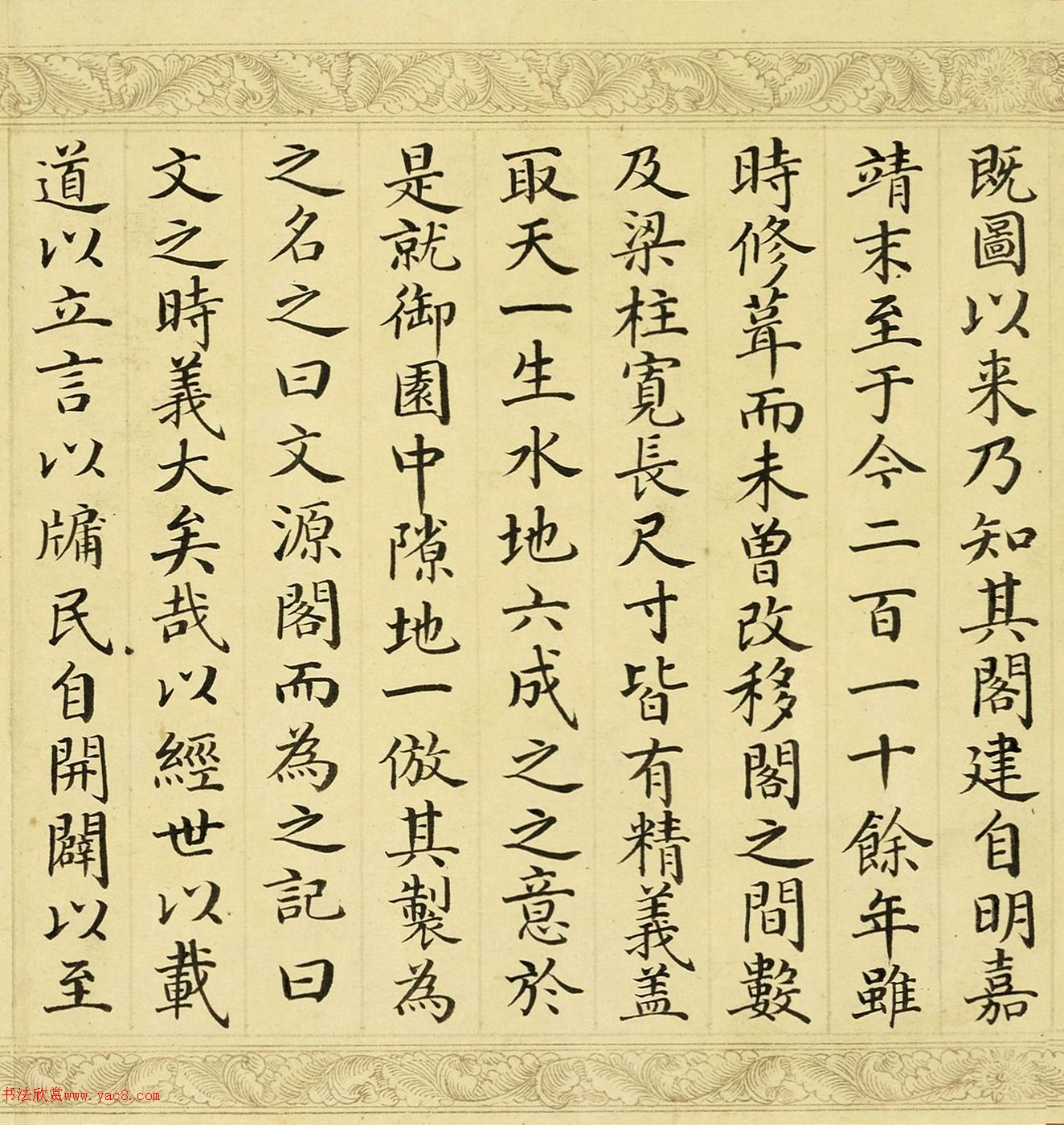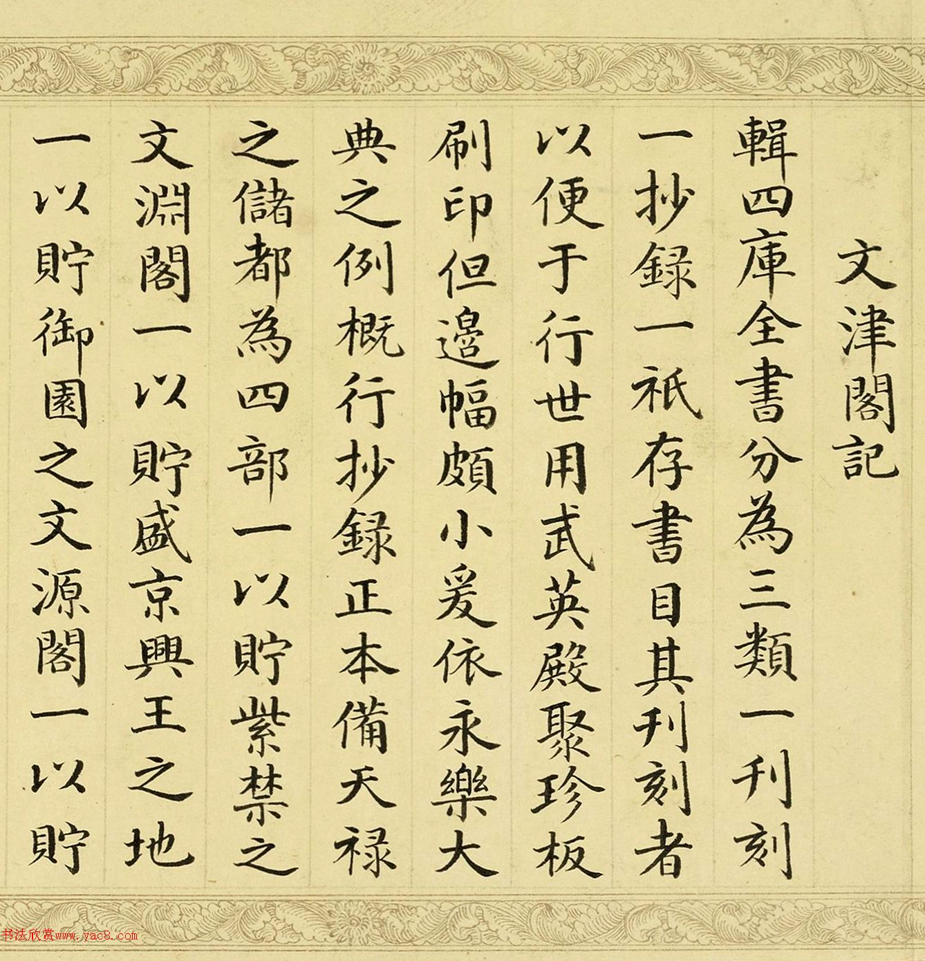 釋文:御製三閣記。文淵閣記。國家荷天。庥承佑命。重熙累洽。同軌同文。所謂禮樂百年而後興。此其時也。而禮樂之興必藉崇儒重道。以會其條。貫儒與道。匪文莫闡。故予蒐四庫之書。非徒博右文之名。蓋如張子所云。為天地立心。為生民立道。為往聖繼絕學。為萬世開太平。胥于是乎。繫故乃下。明詔勅岳。牧訪名山。搜祕簡并出天祿之舊藏。以及世家之獨弃。于是浩如淵海。委若邱山。而捴名之曰四庫全書。蓋以古今數千年。宇宙數萬里。其間所有之書雖夥。都不出四庫之目也。乃掄大臣俾總司。命翰林使分校。雖督繼晷之勤。仍予十年之暇。夫不勤則玩日愒時有所不免。而不予之暇則又恐欲速而或失之踈畧。魯魚亥豕因是而生。語有之凡事豫則立。書之成雖尚需時日。而貯書之所則不可不宿構。宮禁之中不得其地。爰於文華殿後建文淵閣以待之。文淵閣之名始于勝朝。今則無其處。而內閣大學士之兼殿閣銜者。尚存其名。茲以貯書。所為名實適相副。而文華殿居其前。乃歲時經筵講學所必臨。于以枕經葃史鏡已牖民。後世子孫奉以為家法。則予所以繼繩祖考覺世之殷心。化育民物返古之深意。庶在是乎。庶在是乎。閣之制一如范氏天一閣。而其詳則見於御園文源閣之記。文源閣記。藏書之家頗多。而必以浙之范氏天一閣為巨擘。因輯四庫全書。取其閣式。以構庋貯之所。既圖以來。乃知其閣建自明嘉靖末。至于今二百一十餘年。雖時修葺。而未曾改移閣之間數。及梁柱寬長尺寸皆有精義。蓋取天一生水地六成之之意。於是就御園中隙地一。倣其製為之名之曰文源閣。而為之記。曰文之時義大矣哉。以經世。以載道。以立言。以牖民。自開闢以至于今。所謂天之未喪斯文也。以水喻之。則經者文之源也。史者文之流也。子者文之支也。集者文之派也。支也流也。皆自源而分集也。子也史也。皆自經而出。故吾于貯四庫之書首重者經。而以水喻文。願溯其源。且數典天一之閣。亦庶幾不大相徑庭也夫。文津閣記。輯四庫全書分為三類。一刊刻。一抄錄。一祇存書目。其刊刻者以便于行世。用武英殿聚珍板刷印。但邊幅頗小。爰依永樂大典之例。概行抄錄正本。備天祿之儲。都為四部。一以貯紫禁之文淵閣。一以貯盛京興王之地。一以貯御園之文源閣。一以貯避暑山莊。則此文津閣之所以作也。于是乎分焉。欲從支派尋流以溯其源必先在乎。知其津弗知津。則躡迷途而失正路。斷港之譏有弗免矣。故析木之次麗乎。天龍門之名標呼。地是知津為要也。而劉勰所云道象之妙。非言不津津。言之妙非學不傳者。實亦先得我心之所同。然夫山莊居塞外伊古荒畧之地。而今則閭閻日富。禮樂日興。益茲文津之閣貯以四庫之書。地靈境勝。較之司馬遷所云名山之藏。豈啻霄壤之分也哉。臣曹秀先敬書。