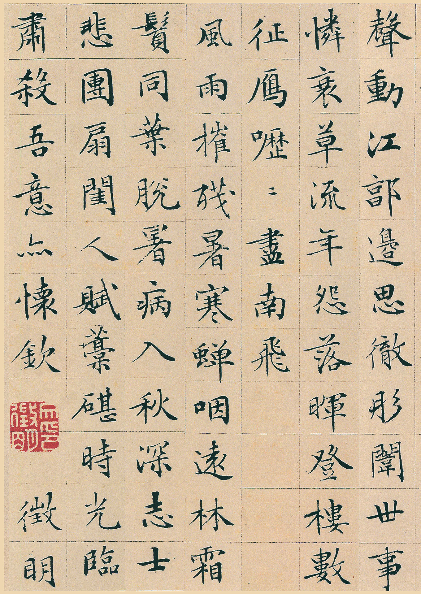 文徵明小楷《次彭孔嘉秋怀三首》 2025/8/30 作者:书法欣赏 来源:www.yac8.com 阅读:642 文徵明小楷《次彭孔嘉秋怀三首》 文徵明书法初师李应祯,后广泛学习前代名迹,篆、隶、楷、行、草各有造诣。尤擅长行书和小楷,温润秀劲,法度谨严而意态生动。虽无雄浑的气势,却具晋唐书法的风致,也有自己的一定风貌。小楷笔划婉转,节奏缓和,与他的绘画风格谐和,有“明朝第一”之称。 款识:徵明 该文章所属专题:文徵明书法 上一条 王宠行书《初八日湾中开船》 下一条 清代桂馥隶书集册
