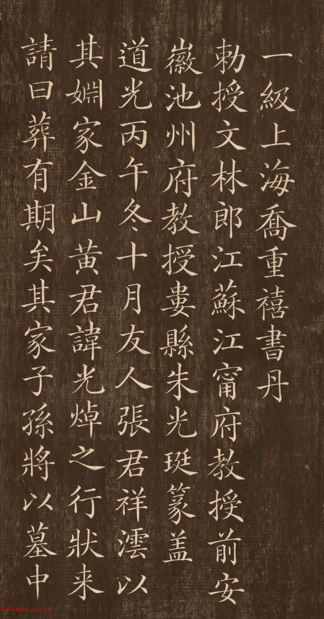 乔重禧楷书《黄光焯墓志铭》 2025/8/24 作者:书法欣赏 来源:www.yac8.com 阅读:790 清吏司主政候選知府槐江黃君墓志銘,姚椿譔文,喬重禧書丹。拓本册页收藏于日本。 上一页跳页下一页 上一条 拓本题岳飞题咏集(日本藏) 下一条 唐代楷书《大唐故管公墓志并序》