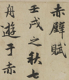赵孟頫书法作品欣赏《前赤壁赋》纸本册装,每页纵27.2厘米,横11.1厘米。台北故宫博物院藏。末署“大德辛丑正月八日,明远弟以此纸求书二赋,为书于松雪斋,并作东坡像于卷首。子昂。”辛丑为大德五年(公元1301年)时赵孟頫48岁。该帖分行布白疏朗从容,用笔圆润遒劲,宛转流美,风骨内...