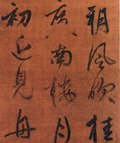 赵孟頫行书杜甫诗轴,绢本,129×48cm,河南平原博物院藏。此五言诗轴,为新乡博物馆旧藏。内容为书唐代杜甫舟中夜雪、有怀卢十四侍御弟诗一首。此轴书法风格一反赵孟頫在书作中的中锋到底、秀媚妍美之气象,而是有感而发,一气呵成。中侧锋并用,提按分明,下一点如高山坠石,作一撇如力士拉弩...