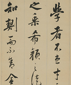 清劉墉行書詩卷,23.4x234.6公分,台北故宫博物院藏。 釋文:禪。本志慕求佛。有時思得仙。亦知春色好。終愛月(點去)夜光圓。龍虎何勞伏。人牛莫放眠。華嚴寶樓閣。彈指浩無邊。 觀物四首。 仙。鰲極鵬霤恣意逰。白雲滄海幾春秋。山川似昔人誰在。龍虎歸元鼎亦休。...