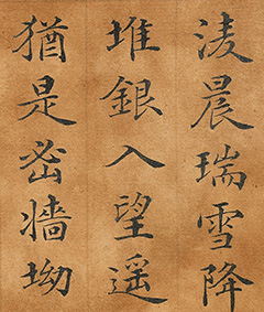 王宠书杂诗册,十二开,台北故宫博物院藏。王宠诗作清逸,此册计书七言律诗六首,虽为草写,但字字独立,甚少连笔牵丝,笔势凝重,具干净俐落之韵。其中转笔处带圆润,收尾常带反捺笔,显露硬拙峻拔的笔调。 釋文:(第一則)夜燕石湖草堂。風竹泠泠虛草堂。春星歷歷淨琴張。冥...