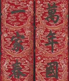 清朝乾隆皇帝御笔对联,故宫博物院藏。 江山万年国,天地一家春。上联的“国”字,虽为现代汉语中的二声,但在古汉语中为仄声,可用做上联尾字。 乾坤增瑞色,宫殿纳春和。 富贵三春景,平安两字金。同样字句的对联,亦贴在养心殿中。 天地三阳泰,乾坤万国春...